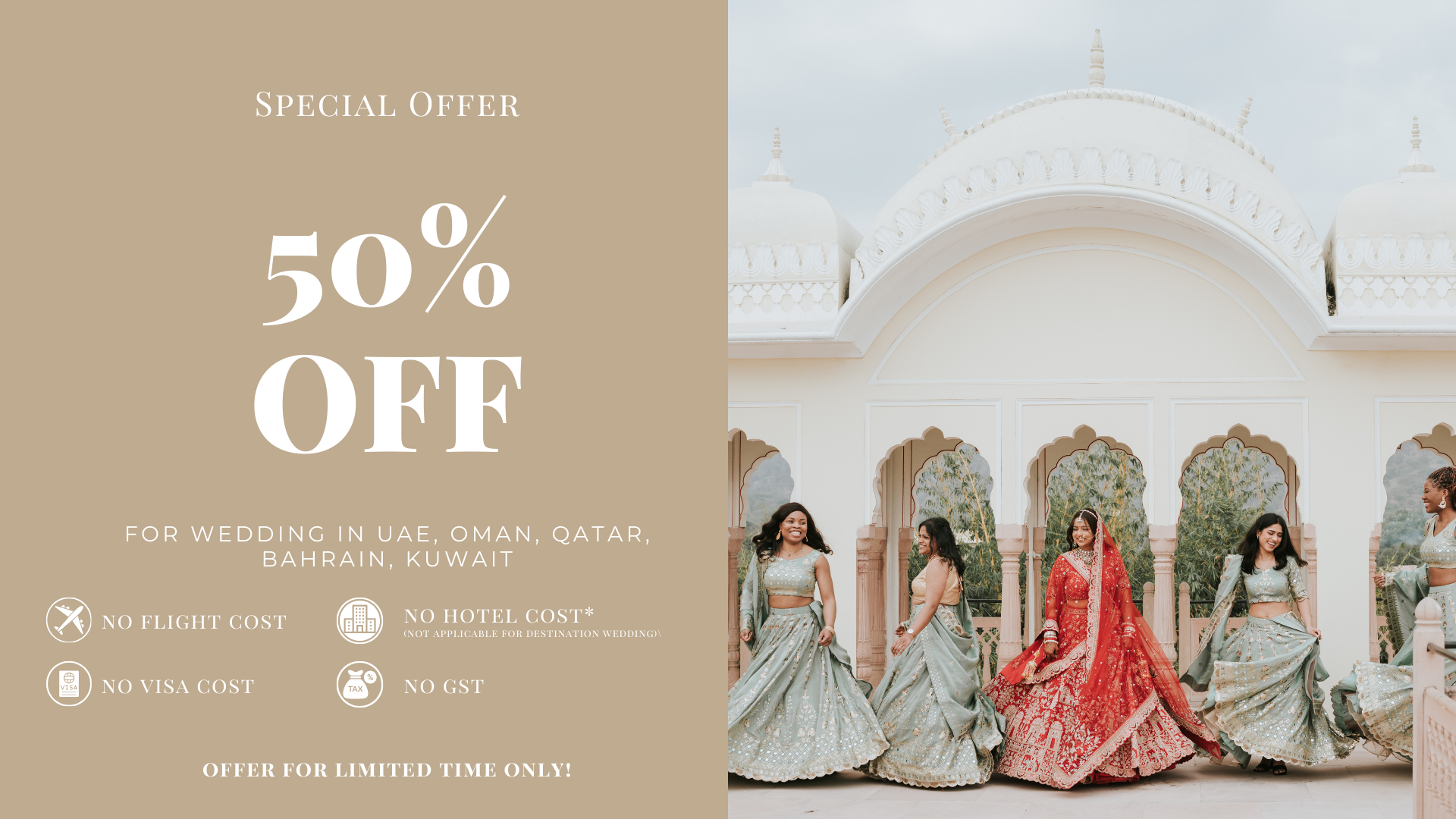 Book now and save half the regular price—this exclusive offer is valid for a limited time only and applies only to bookings for the upcoming wedding season.